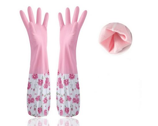 Перчатки хозяйственные удлиненные цветочками с подкладкой розовый Р-2 /200/